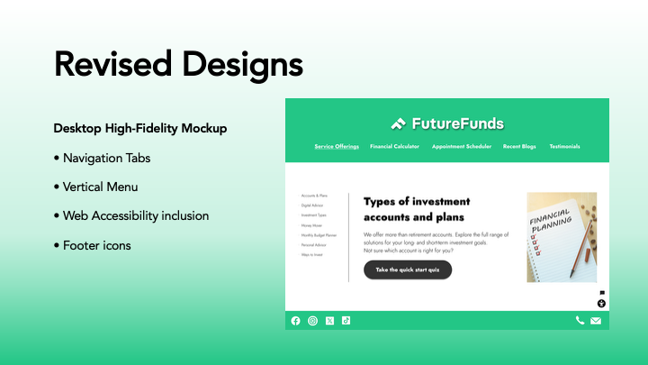 My revisions for Future Funds include using the client's brand color palette of green, black, and white. I created to landing pages for desktop and mobile. For the desktop versions, I made a static navigation bar with five topics, a vertical sidebar menu, a call to action button, and buttons along the bottom for social media and email communication. The mobile version has a logo and hamburger menu option in the header, the main topic of the site with a call to action button, and communication button icons along the footer. Typography was improved by using a hierarchy of importance.