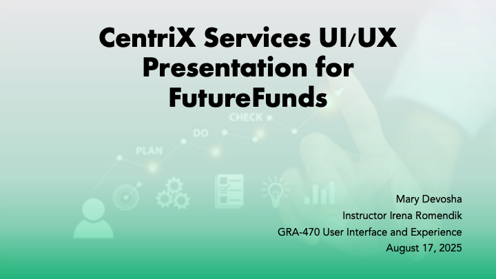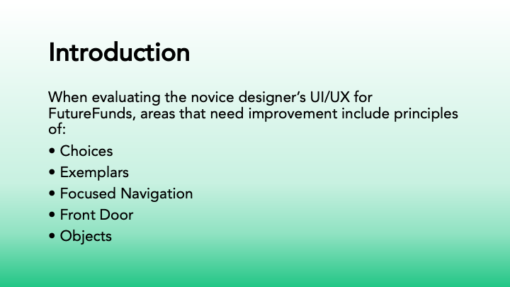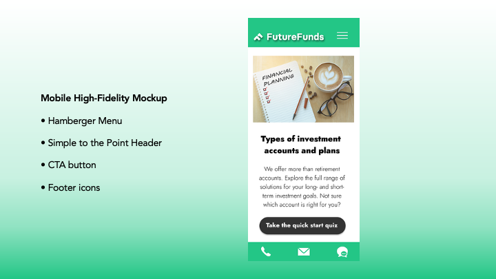PowerPoint presentation discussing the process of UI/UX design and steps. This is a project for a fake company called Future Funds, targeting young professionals who want to start a retirement fund or gain better control over their finances. I have created a design using the company's brand style guidelines for color palette and logos. The client sent user feedback on the novice designer's submission, and I was hired to redesign the website and create landing pages for both desktop and mobile.