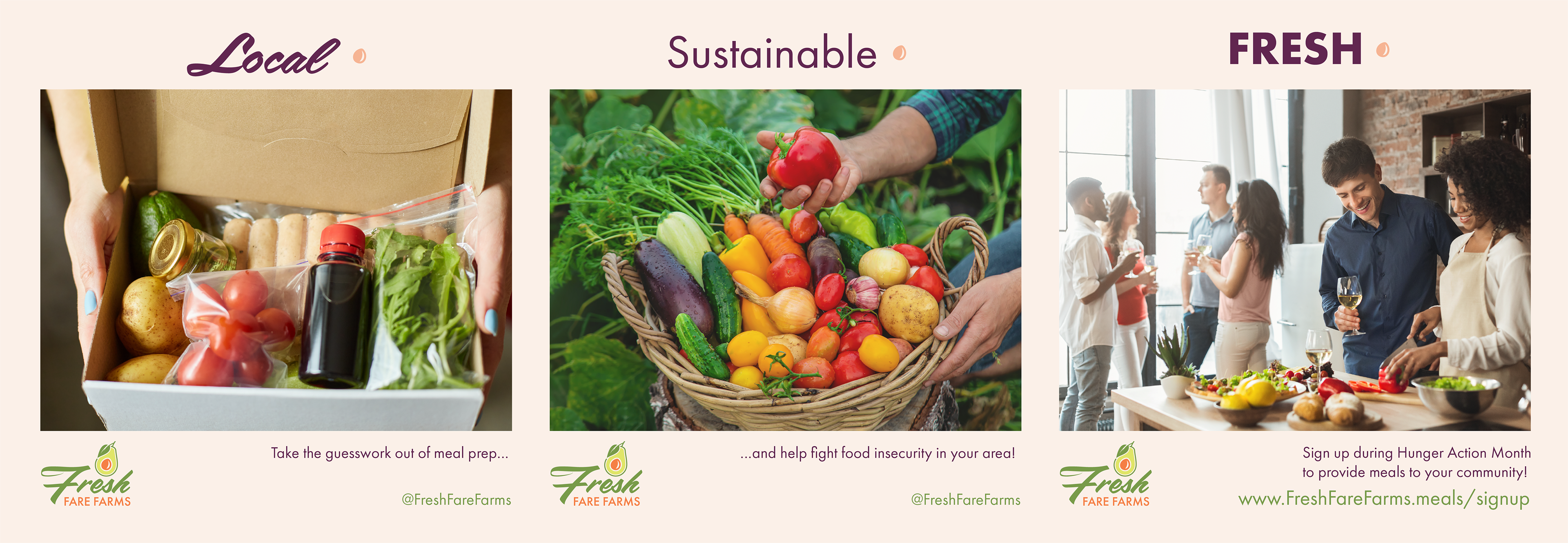 Fresh Fare Farms multichannel design project was used for a full-page magazine ad, social media carousel, and an animation banner. The local organic farm, offering local meal prep boxes, was intended to target diverse young professionals and families aged 25 to 35 with busy schedules. The campaign also allows individuals to sign up to donate a meal prep box to help offset meal insecurities in the community.