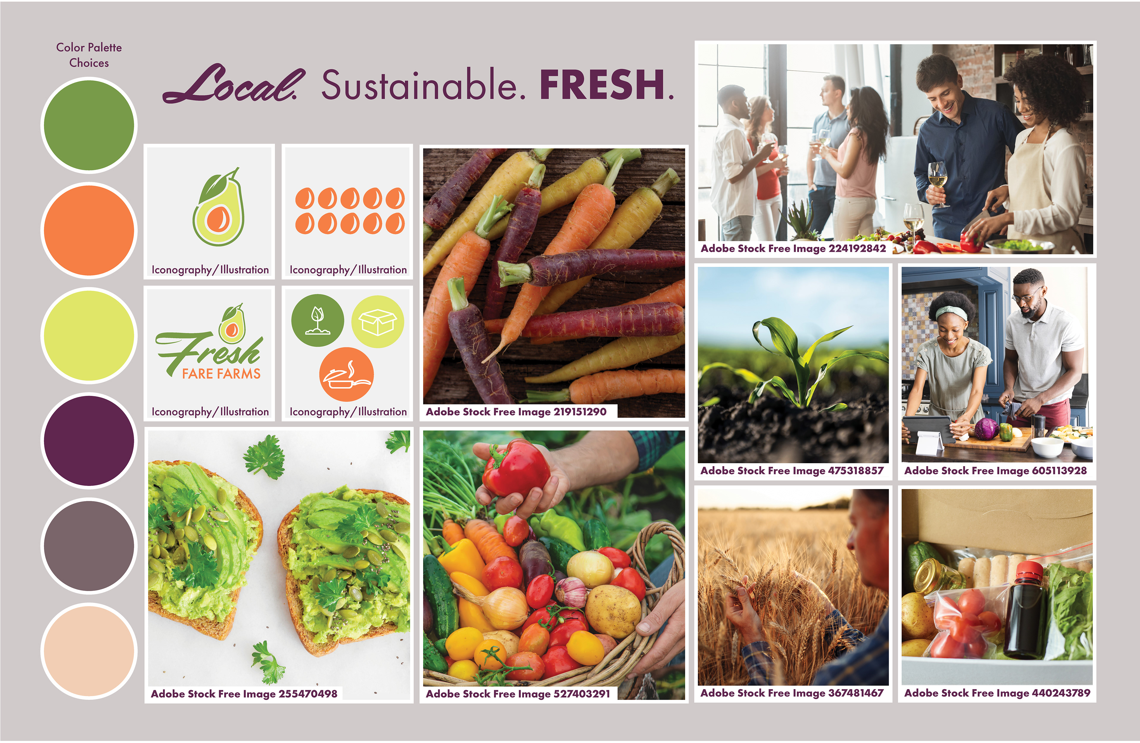 After doing photo research, I created a mood board for the multichannel design project. Each project begins with the farmer caring for crops and fresh harvests, which are then processed into meal kits and delivered to homes, where fresh preparations take place. Each channel demonstrates diversity in space, flow, and imagery, influenced by size and the application used to create static text or animations.